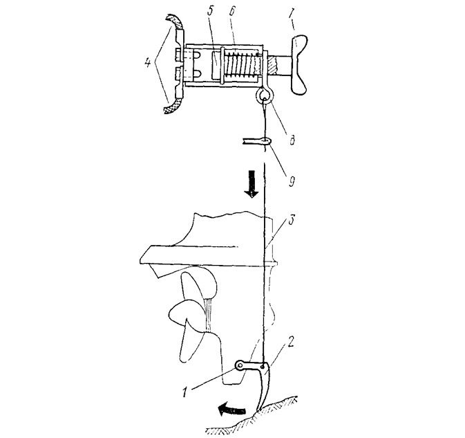 Для этого необходимо шарнирно соединить перо руля 1 с задней ручкой мотора 3 при помощи трубчатой тяги 2. В этом случае при плавании с работающим подвесным мотором при отклонении румпеля поворачивается и мотор.