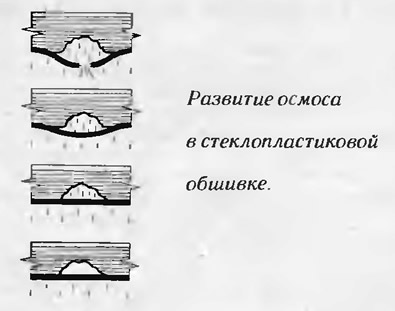 При длительном нахождении пластмассового корпуса в воде (обычно в течение 5—10 лет) осмос может нанести существенный вред прочности и особенно водонепроницаемости наружной обшивки. Процесс протекает более интенсивно в пресной воде. В этом случае разность в концентрации раствора внутри пузырьков и за бортом больше, чем в морской воде, которая сама является раствором.