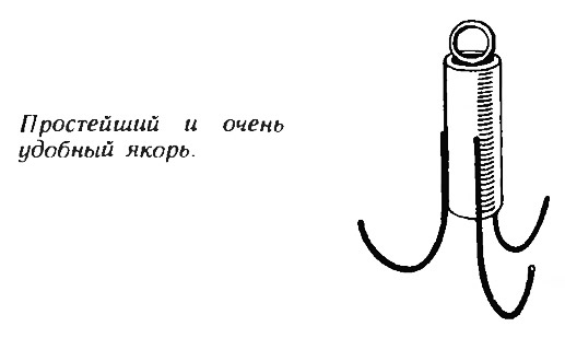 Поэтому для таких водоемов лучше всего подойдет простой самодельный якорь, который можно сделать из куска стальной трубы и приваренных к ней трех прутов толстой отожженной проволоки. Лапы такого якоря хорошо держат даже на песчаном дне не говоря уже о каменистом. А при снятии с якоря потребуется только небольшое усилие, чтобы разогнуть его лапу, зацепившуюся за камень. В походном положении папы можно выпрямить либо, наоборот, прижать к трубе, а якорь спрятать в брезентовый чехол.