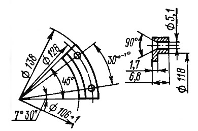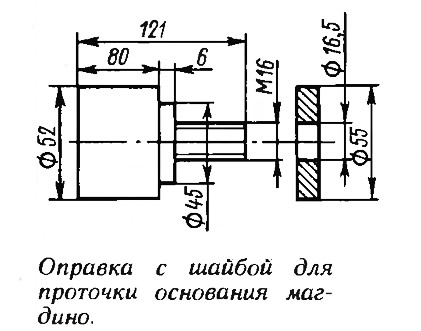 С основания магдино пришлось снять катушки зажигания и освещения, прерыватели, рычаг поворота основания, резиновое уплотнение для вывода проводов. Для обработки торца основания, опирающегося на верхнюю крышку картера, изготовил оправку. Глубина проточки торца — 1 мм. Затем на фрезерном станке отфрезеровал два места на верхнем торце основания для установки бронзовых сегментов под сухарики. Толщина проточенного и фрезерованных участков основания должна быть равна 3 мм. При фрезеровке основание нужно установить так, чтобы непараллельность обработанных поверхностей не превышала 0,03 мм.