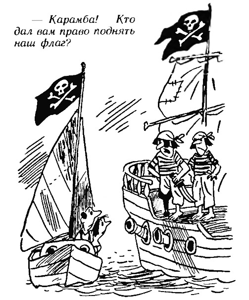 Бывает, что молодые судоводители-любители поднимают на своих судах флаги «собственного изобретения» — вплоть до пиратских, с безобразными эмблемами и надписями. Такую самодеятельность общественность стоянок и клубов должна немедленно пресекать. Флаг — не игрушка, а знамя корабля. Такое отношение к флагу и надо воспитывать у молодежи.
