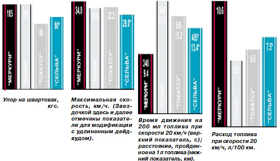 Экономичность. Для испытаний мы использовали мерную емкость, в которую заливали ровно 200 г бензина. При этом засекалось время, за которое это количество топлива будет израсходовано тем или иным мотором на лодке "Корсар-Командор" с одним водителем при скорости 20 км/ч — то есть при устойчивом глиссировании, режиме достаточно быстром и при этом экономичном. Наибольшую умеренность в потреблении топлива проявила, как видно из таблицы, четырехтактная "Хонда", самым прожорливым оказался близкий по тяговым параметрам "Меркури".