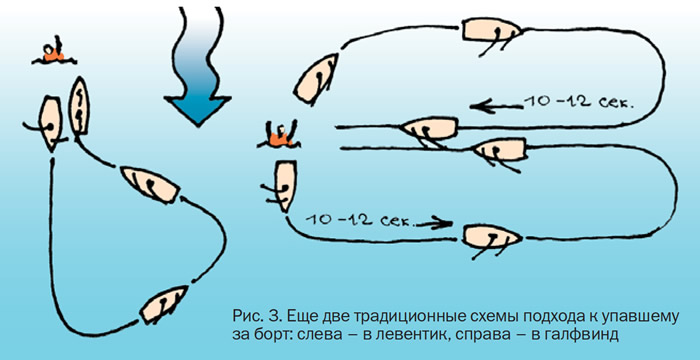 Все вышесказанное относится прежде всего к парусным яхтам: если на моторных судах маневр этот практически всегда однотипен (в подавляющем большинстве случаев это обычная циркуляция), то для парусников подход к упавшему за борт человеку зависит от курса яхты и направления ветра. Так получилось, что человек, учивший меня парусному делу, относился к процессу весьма ответственно - наша яхта, например, никогда не уходила даже в сравнительно короткий поход на питерские форты без того, чтобы «молодые» прямо на акватории яхт-клуба не показали свое умение поднимать из воды «утопа», в качестве которого обычно выступала деревянная колобашка.