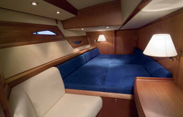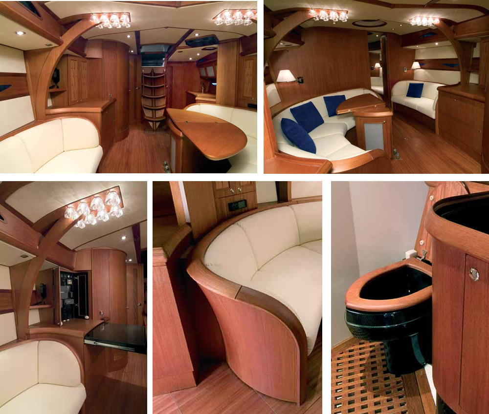 Аристократизм интерьера ощущается во всем: в диванах, форма которых напоминает бутон тюльпана, в отделке бортовых зашивок и подволоков, в раскладном столе-баре, который мог бы стать украшением кабинета в солидном доме. Изящные «комод» и шкафчик маскируют штурманское место: достаточно выдвинуть штурманский стол из-под столешницы и открыть дверцы шкафа, и перед вами - пост управления яхтой.