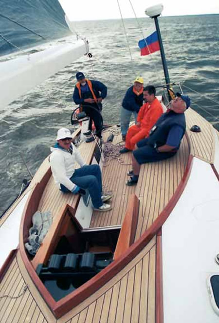 Сама лодка легка и послушна, довольно быстро разгоняется на порывах, а при ветре 8-9 м/с показала скорость 9.1 уз при ходе примерно под углом 38° к истинному ветру - это превосходит результаты недавно испытанной нами «DK 46» («КиЯ» №201), которую соперники по мировым регатам назвали «unbeatable» («непобедимая»). И это при нетипичном для скоростного судна - весьма изысканном и комфортабельном - интерьере российской яхты, на фоне которого салон «DK 46» (неплохой, по сути) выглядит простой «мыльницей». При этом совершенно очевидно, что у «Пифагора» есть еще резерв скорости - за счет дополнительной подстройки грота. Однако нельзя дать гарантию, что «Мобиле 47» сохранит это превосходство над «азиатским тигром» на всех курсах - мы просто не смогли провести ее всесторонние испытания.