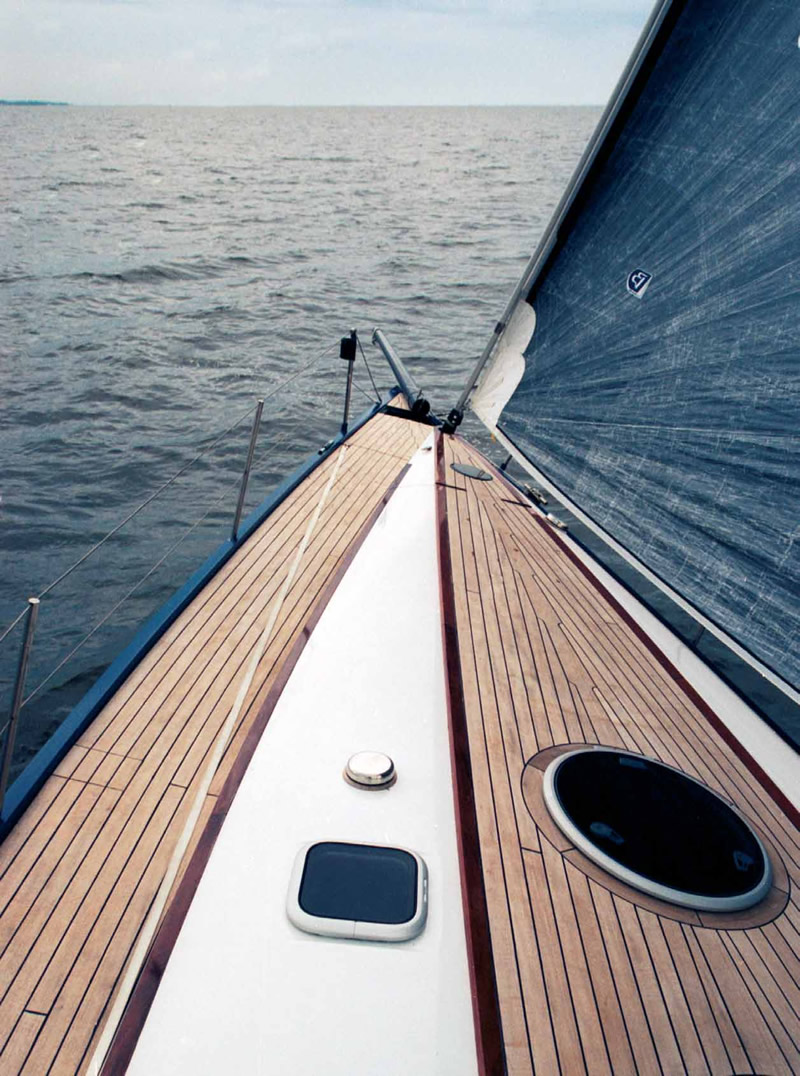 Что касается собственно конструкции корпуса, то яхта и в самом деле углепластиковая, а в качестве наполнения сэнд-вичевого корпуса и палубы использован материал типа «Divincell». Для повышения ударной стойкости в наружном слое обшивки корпуса применен кевлар. Из композитных материалов сделан и глубокий плавник, несущий массивный бульб свинцового балласта. Любопытно, что для повышения жесткости (и аварийной плавучести) все неиспользуемые пустоты корпуса (включая таранный отсек в нос от форпика) заполнены специальной пеной.