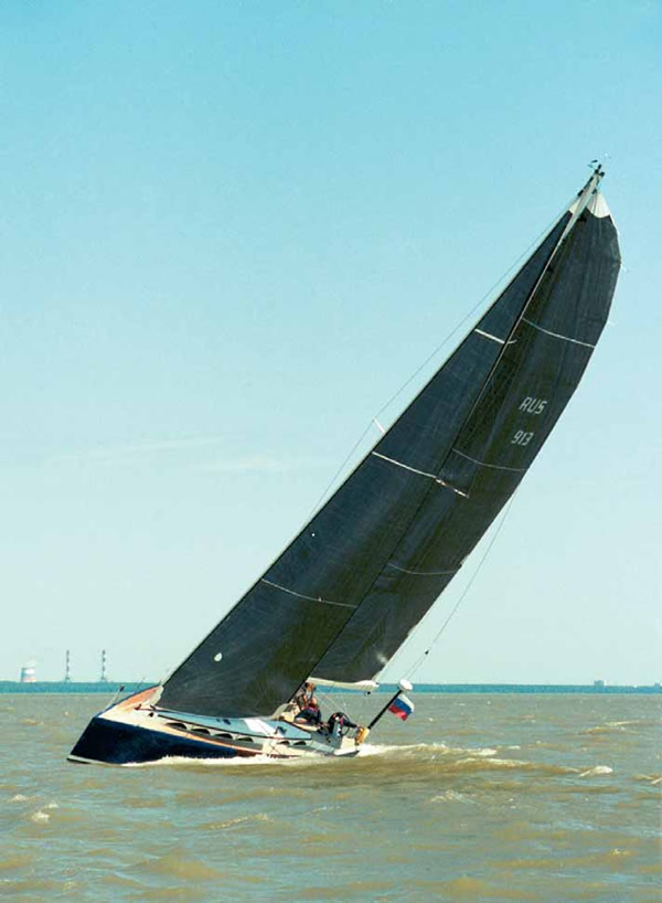 Хотя, по мнению конструктора яхты О.Ларионова, достоинства новой лодки должны раскрываться на полных курсах - и здесь уже при ветре 11-12 м/с яхта проявляет четкое стремление выйти на режим серфинга. Надо отметить и то, что кренится «Мобиле 47» на острых курсах, несмотря на глубоко расположенный балласт, довольно охотно - вплоть до 30-35°, что обусловлено достаточно высокой энерговооруженностью «Пифагора». Впрочем, даже сильный крен не кажется пугающим - судно идет уверенно, и в кокпите чувствуешь себя вполне безопасно.