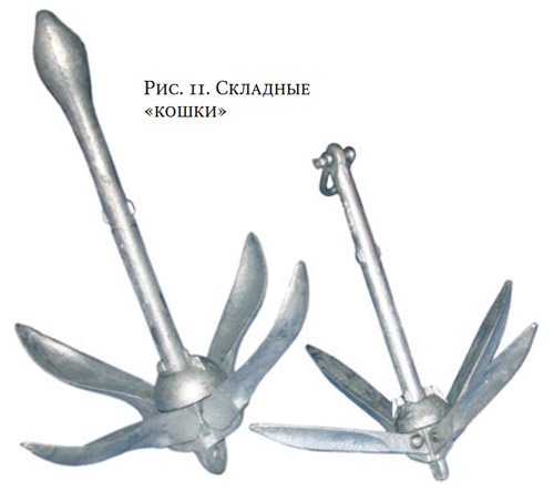 Кошки и «грибы» (рис. 11). Подобные якоря обычно используются для коротких остановок в хорошую погоду. Если говорить о китайских образцах (1.5-10 кг), то все они складные, и найти им место легко даже на самой маленькой лодке (правда, некоторые сомнения вызывают поворотные запорные кольца — не исключено, что якорь в определенных условиях может сложиться сам собой, но при «повседневной» направленности это не так страшно). Для песчаных грунтов выбирайте «кошки» с более широкими ложкообразными лапами, для камней и водорослей нужны лапы потоньше и поострее. Неплохо работает на песчаных и илистых грунтах также якорь-«гриб» (тарелка с веретеном, которое на ряде моделей можно отвинтить), но в наших магазинах эта разновидность встречается крайне редко.