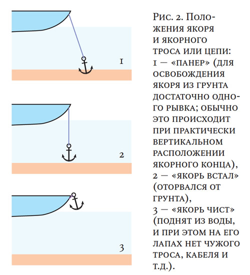 В заключение хотим лишний раз предостеречь вас от распространенных ошибок, которые обычно вызываются спешкой и неразберихой на палубе. Во-первых, перед отдачей якоря обязательно убедитесь, что одним концом якорный трос привязан к якорю, а другим — к лодке. Коренной конец якорной цепи тоже должен быть надежно закреплен в якорном ящике. Если в нем нет специального рыма (такое, увы, бывает), временно завяжите на цепи стопорный узел и закрепите его шкертиком или проволокой. Во-вторых, не начинайте движение до тех пор, пока якорь не будет полностью вытащен на палубу или в кокпит. И в-третьих, при отдаче якоря, особенно тяжелого, не наступайте ногами в петли уложенного на палубе якорного троса.