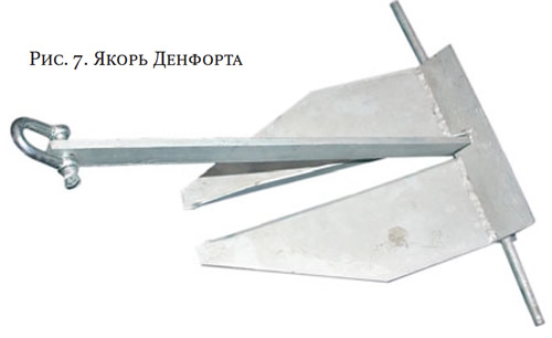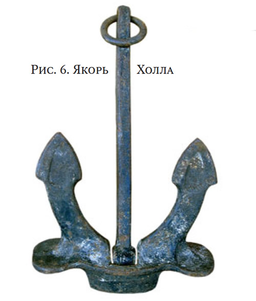 Якорь Холла (рис. 6). Тоже ветеран, хотя и бесштоковый. Быстро забирает на слабых грунтах, неплохо цепляется за камни, но высокой держащей силой не отличается — массивные, большого сечения лапы относительно коротки, а объемистая «коробка» шарнира мешает глубокому проникновению в грунт. Она же является причиной еще одного недостатка — нередко, набрав в себя песок или мелкую гальку, заклинивает.