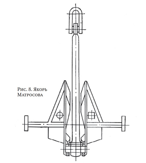 Якорь Матросова (рис. 8). По длине лап представляет собой нечто среднее между якорями Холла и Денфорта, плюс снабжен штоком с вертикальными «щечками» на лапах. Забирает быстро. По держащей силе на песке уступает «легковесу», но более универсален — увереннее работает в камнях. Недостаток тот же, что и у Холла — может заклинить шарнирную «коробку». Хорошо переносит развороты судна на 360°. В «массовых» магазинах, правда, не встречается.
