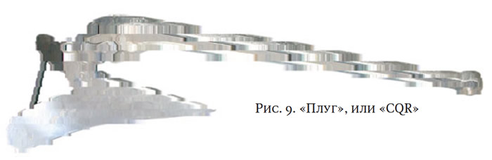 «Плуг» (рис. 9). Иначе именуется «CQR» — если быстро произнести эту аббревиатуру, получится английское «se-cure» («надежный»). И впрямь очень напоминает сельскохозяйственный инструмент — представляет собой шарнирно закрепленный на веретене лемех. Шарнир служит для того, чтобы упавший на дно якорь перевернулся и захватил грунт. Согласно сведениям Ллойда, относительная держащая способность на плотном песке составляет 18:1, но на илистом грунте «плуг» держит не столь уверенно. Хорош также на камнях, легко проникает сквозь траву и тину, практически не ползет при разворотах судна под влиянием ветра. Весовой диапазон — 9-15 кг.