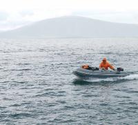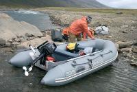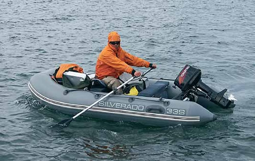 Для экспедиции была выбрана надувнушка «Silverado 33S» и двухтактный подвесник «Tohatsu 9.8». Данная парочка была подобрана из чисто экономических соображений: при весе 63 кг ширина «судна» была 175 см, а диаметр борта — 46 см. Движок весил всего 26 кг, и при 5500 оборотах инструкция обещала потребление всего 4.9 л смеси на час работы. На такие цифирки совершенно не обращаешь внимания в погожие летние деньки, будучи на деревянных бонах где-нибудь под Приозерском. Совсем иные сценарии пишутся для водно-моторных «боевиков», разыгрывающихся севернее полярного круга при волне более метра, скорости ветра под 20 м/с и 4° тепла.