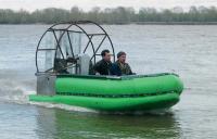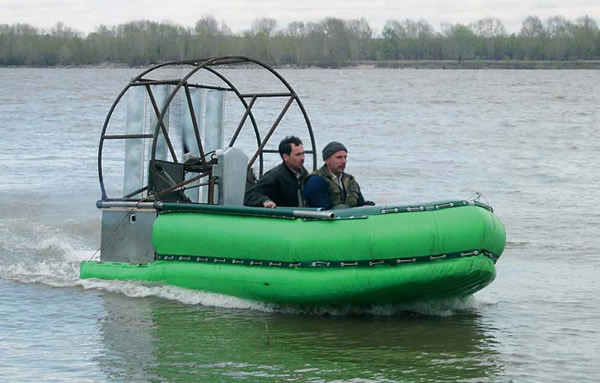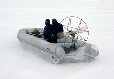 Весьма похожий эксперимент поставила петербургская фирма «Ротан», производящая надувные суда, в том числе четырехметровые надувнушки с нижними поплавками типа скегов на корпусе. Такая лодка с легким 25-сильным мотором от параплана и двумя-тремя седоками прекрасно чувствует себя на воде, льду и чуть хуже - на снежной целине. Оригинальна установка мотора - на вертикальной штанге-оси, что обеспечивает уникальную управляемость без рулевых пластин. На большой, пятиметровой, лодке «ротановцы» установили ограждение между скегами и моторчик от бензопилы с небольшим вентилятором - и вот перед вами уже судно на воздушной подушке! Испытания его вполне оправдали надежды. Вот только бачка топлива от бензопилы надолго не хватит.