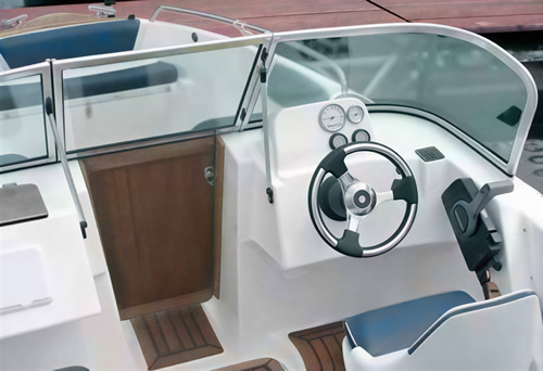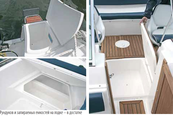 Грамотно распределены по пространству судна объемы для хранения багажа и снабжения. Не надо думать, куда спрятать якорь, концы и кранцы - запираемые защелками отсеки оказываются тут же под рукой у каждой швартовной утки. Логично выглядят и два трюмных ящика под пайольными люками. Не вполне эргономичны, впрочем, верхние плоскости консолей - рулевой и «штурманской». Брошенные на них мелкие предметы, не удерживаемые никаким ограждающим бортиком, очень быстро улетят за борт; всю мелочь необходимо предусмотрительно складывать в специальные отсеки, впрочем это легко доработать. Несмотря на наличие длинного релинга в кокпитах, пассажиру в левом кресле тоже сложно ухватиться за что-либо: в его распоряжении - только рамка ветрового стекла да подпирающая стойка на расстоянии вытянутой правой руки. Неплохо было бы предусмотреть небольшую скобу на консоли, как это обычно делается на лодках подобного типа.