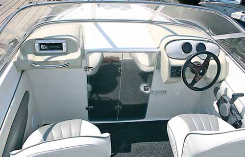 Оба «пульта» - и водительский с постом управления, и пассажирский с «музыкой» - тоже решены в характерном для лодок из США стиле «биодизайна». Даже приборная панель тут мягкая, с виниловой обивкой. Единственно, общее впечатление несколько портят головки крепежных винтов - наверное, лучше было бы использовать сплошную «липучку», которая надежно удерживает панель даже при сильной тряске, но позволяет при этом снять ее без помощи инструментов, если возникнет нужда подобраться к приборам «с изнанки».