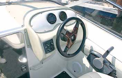 Надо сказать, что и стандартное оснащение довольно богатое - сюда входят не только стояночный тент-покрышка, но и такие «элементы роскоши», как съемное ковролиновое покрытие кокпита, по которому куда приятнее ходить босиком, чем по голому пластику, регулируемые мягкие кресла, складной купальный трапик, дополненный удобной ручкой, и даже аудиоподготовка - пара «морских» широкополосных динамиков, бокс для магнитолы и антенна. Для полного счастья не хватает только маленького коврика с фирменным логотипом, чтобы не наступать на подушку заднего сиденья при посадке в лодку - прыгать с планширя прямо в кокпит, честно говоря, высоковато.