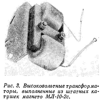 Это потребовало, например, изменения моточных данных зарядной и управляющей катушек и введения ограничительного резистора R1 в цепь управляющего электрода тринистора. Одновременно три полюсных наконечника обеспечивают повышенную мощность цепей накопления энергии и управления.