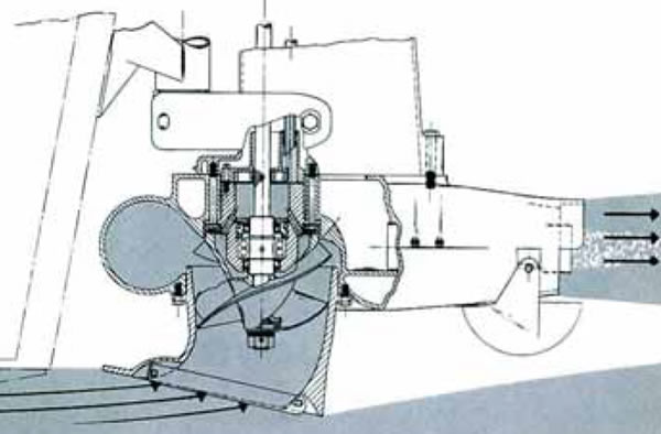 Американцы при решении этой проблемы пошли другим путем. Они применили центробежный насос1, который в принципе не нуждается в спрямляющем аппарате. И ротор этого насоса, представляющий собой конический шнек, гораздо меньше повреждается от попавшей гальки и песка. При этом, правда, КПД комплекса резко уменьшился. Потеря составила около 30% по сравнению с винтовым вариантом. Но, как показала практика, это решение было верным. Уже много лет такие водометы устанавливаются на подвесные моторы и эксплуатируются в основном на мелководных реках (рис. 2).