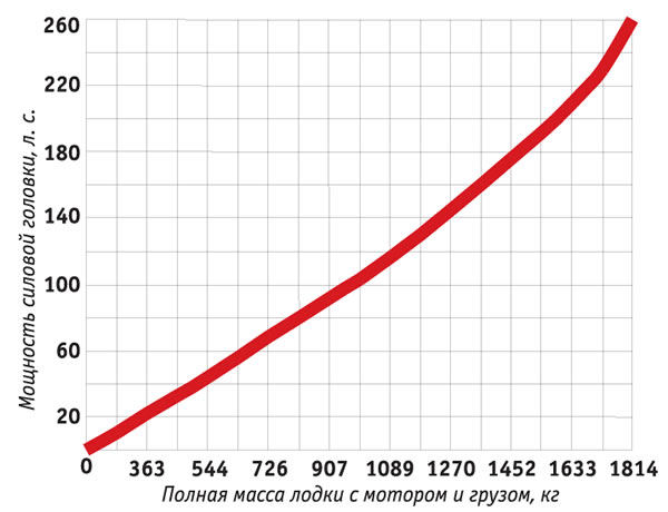 Для определения необходимой мощности или же возможной загрузки лодки можно воспользоваться графиком (рис. 11), который рекомендуют производители насадок.