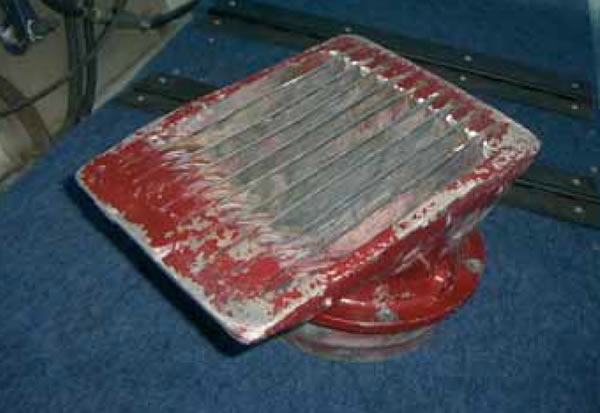 Больше всего повреждений приходится на водозаборник — "сапог", так как он все-таки немного выступает под днищем лодки. Когда лодка проходит впритирку по камням, он может зацепиться за эти камни или дно. Если мотор при этом зафиксирован жестко и не может откидываться, то нагрузки на "сапог" очень большие, и его можно просто сломать или даже оторвать, а то и вырвать мотор с транца. Поэтому обязательно на мелких местах ставьте систему фиксации мотора в режим свободного откидывания. Заусенцы и сбои на "сапоге" (рис. 7) запиливаются напильником до тех пор, пока возможно. Потом он просто наплавляется в аргоне — и опять как новый. Пластины решетки из нержавейки относительно мягкие. Они крепятся на обычных штифтах, проходящих через всю ширину приемной части "сапога" (рис. 7). Штифты выколачиваются тупым гвоздем или выдавливаются прессом, пластины снимаются и рихтуются на наковальне. При этом они немного изгибаются, поэтому есть смысл при постановке на место перевернуть их выпуклостью наружу. При следующих ударах они опять выровняются. Вот и все, что можно сказать о его эксплуатации и повреждениях. Это очень надежная техника.