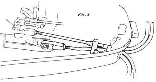 3. Установите рычаг газа в режим холостого хода. Отсоедините трос дроссельной заслонки (на рис. 3. указано типичное положение).