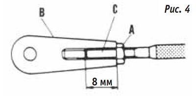 4. Отсоедините трос от замка, ослабьте гайку (поз. А, рис. 4) на конце троса. Установите ДУ и положение магнето при закрытой заслонке и при полностью открытой заслонке. Настраивайте фиксатор B (рис. 4) до тех пор, пока он не будет свободно надеваться на крепление.