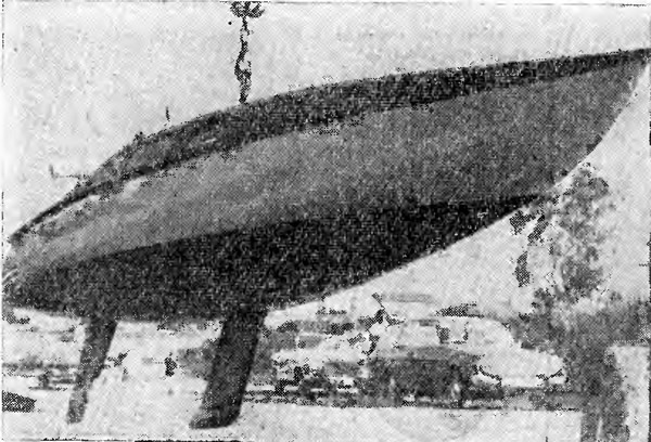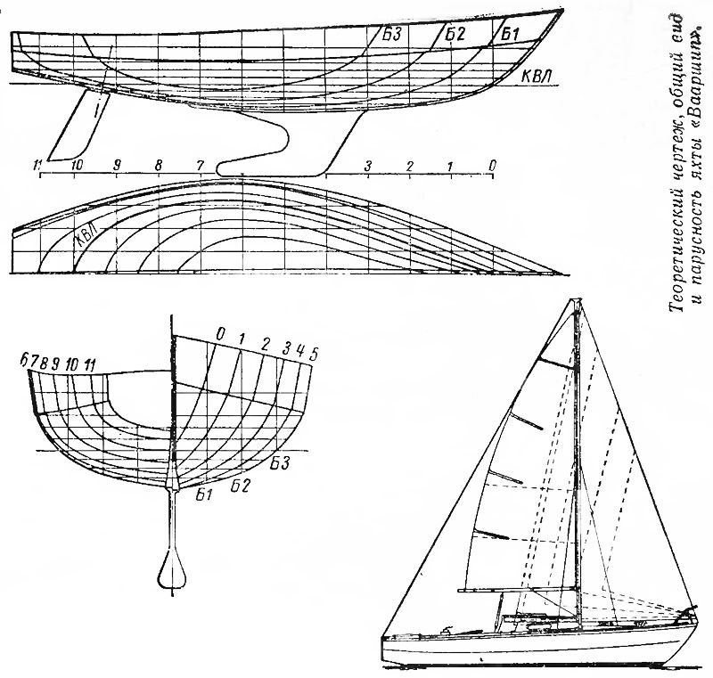 Интересно отметить, что корпус яхты обшит полосами фанеры; получилось что-то вроде клинкерной обшивки. Такой способ, во-первых, позволил получить круглоскулые обводы, более выгодные, чем обычные для фанерных судов остроскулые. Во-вторых, удалось изготовить легкий и прочный корпус с продольным набором в виде стрингеров, идущих по пазам обшивки. Шпангоутов как таковых в конструкции корпуса нет; опорами для стрингеров служат фанерные полупереборки. Вес бульбкиля воспринимается флорами, установленными в средней части днища.