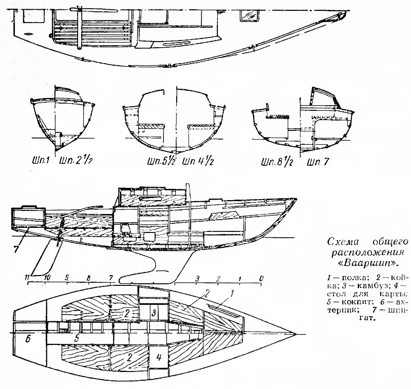 Характерны обводы яхты с заостренными носом и кормой, что дает преимущество при обмере по правилам RORC. Проекция «корпус» теоретического чертежа выглядит, как типичная «рюмка» (термин, нередко применяемый яхтсменами для обозначения обводов типа знаменитого однотонника «Тина»), — с узкой ватерлинией и очень большой шириной при палубе. В сочетании с высоким надводным бортом это обеспечивает хорошую остойчивость на больших углах крена. Форма ватерлиний сильно напоминает швертбот: в носу они слегка вогнутые, а максимальная ширина смещена в корму от миделя. Лодка не рассчитана на глиссирование, но благодаря легкой конструкции (она весит 1,05 т без экипажа) и небольшой смоченной поверхности достигает высоких скоростей в свежий ветер. Смоченная поверхность корпуса в 2,5 раза меньше площади парусности, а это дает «Вааршипу» преимущество перед другими яхтами и в слабый ветер. Напомним, что у большинства яхт соотношение площадей парусности и смоченной поверхности составляет 1,5:1 — 2:1. Такой же узкий и глубокий, как и на «Листанг». руль имеет площадь больше, чем на аналогичных яхтах прежней постройки.