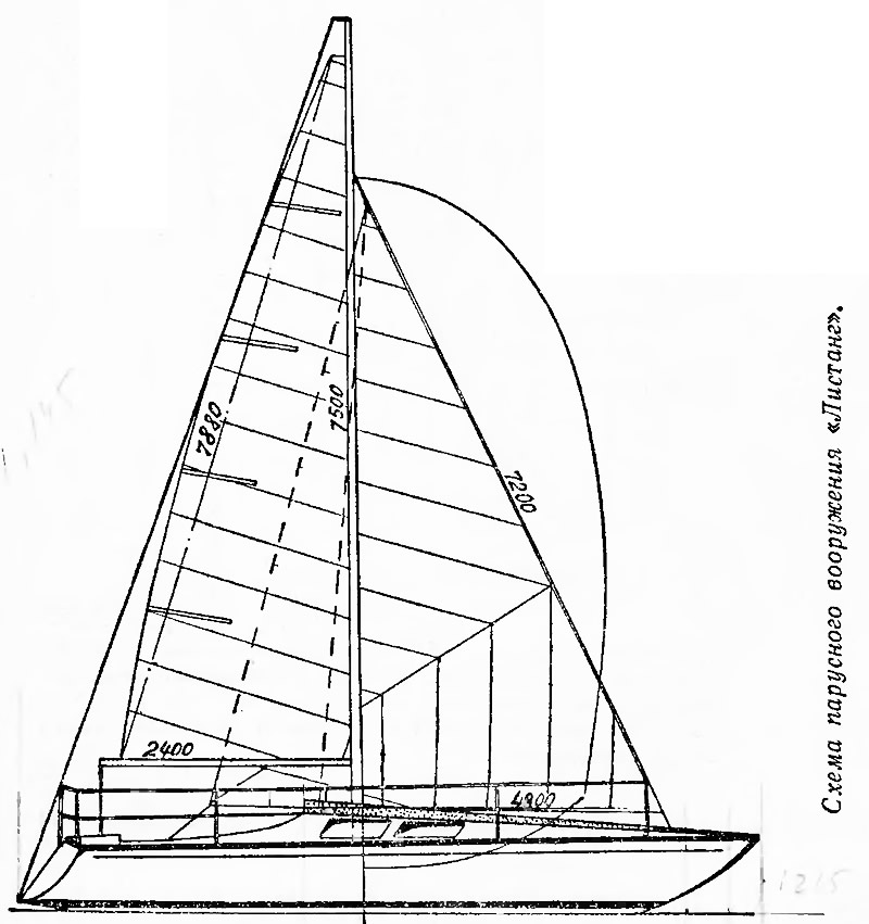Необычно выглядит и парусное вооружение яхты — с мачтой, установленной в корму от миделя, у входа в каюту. По идее Либора, широкий генуэзский стаксель с большим наклоном штага помогает вывести судно на скольжение. Разумеется, «Листанг» снабдили гибкой алюминиевой мачтой, позволяющей регулировать величину и положение пуза на парусах в зависимости от ветра, как и на «Летучем Голландце».