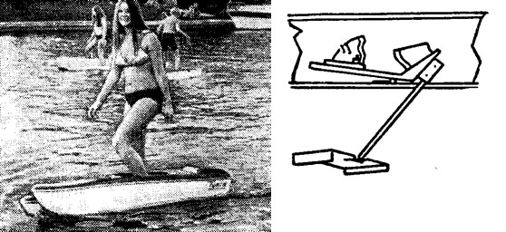 Тьяк — водные коньки — завоевывают все большую популярность в США. Два легких корпуса из пластмассы обеспечивают непотопляемость, а довольно простое механическое устройство (см. рисунок) приводит коньки в движение — для этого достаточно переступать с ноги на ногу. Новинку оценят не только любители «пеших» водных прогулок. Водные коньки — находка для рыболова.