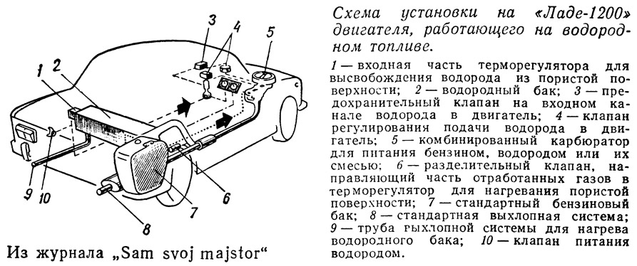 Схема установки на «Ладе-1200» двигателя, работающего на водородном топливе