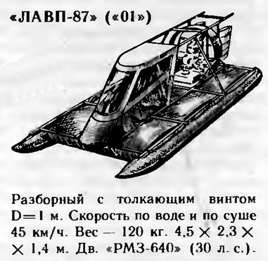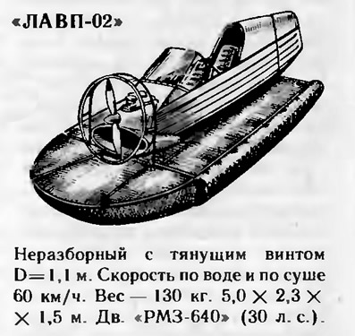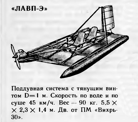 Стоит упомянуть, что в течение нескольких лет в ЦКБ эксплуатировался опытный образец гораздо более тяжелого ЛАВП (сухой вес 300 кг) с метровым воздушным винтом и двигателем от лодочного подвесного мотора «Вихрь-30». Даже с тремя пассажирами на борту аппарат развивал скорость до 110 им/ч. Почему конструкторы отказались от этого, казалось бы, заманчивого варианта! Дело в том, что его конструкция не обеспечивала безопасности движения, поскольку подобный скоростной аппарат уже должен иметь все чисто самолетные элементы управления (и по тангажу, и по крену). Аппарат получался сложнее и дороже, сделать его легкоразборным трудно. Создание аппаратов такого класса — дело будущего!