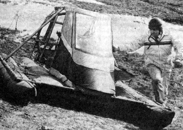 Вот как описывалось в «Советской России» (20.04.88) начало испытаний амфибии в районе Москвы-реки: «Два человека выгрузили из машины небольшой сверток, напоминающий размерами и формой упаковку стандартной двухместной палатки. Они сноровисто взялись за дело, и спустя считанные минуты под опытными руками выросла удивительная конструкция». (Как записано в инструкции по эксплуатации аппарата время его сборки-разборки даже без участия «опытных рук» не превышает 40 минут.)