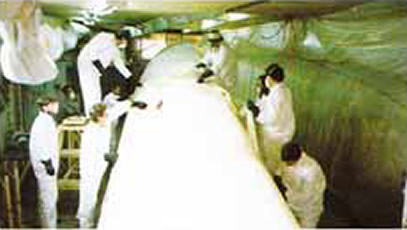 О.: Нет. Дома, на огороде, под легким навесом. Были у меня временами помощники, но главным образом работал один. Особенно досталось, когда пришлось вытаскивать готовый корпус к воде. Тащили его на боку, подкладывая катки и колеса. Заняло это неделю...