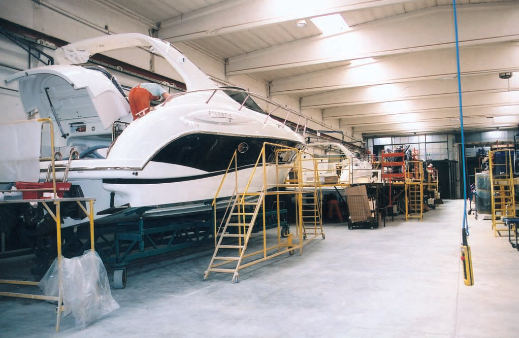 Вручную, как уже отмечалось, завершается формование корпусов, вручную — в отдельном цехе, стыкуют секции корпуса и палубы. А вот дальше начинается то, что заставляет припомнить изобретателя массового производства и знаменитой конвейерной системы — старика Генри Форда. Дедушка Генри наверняка остался бы доволен тем, насколько точно выполняются основополагающие принципы: каждую конкретную работу исполняет «узкий специалист» (набивший в ней руку и при этом легко заменяемый, поскольку определенным операциям можно запросто обучить даже обезьяну), а работа эта занимает ровно отмеренный срок.