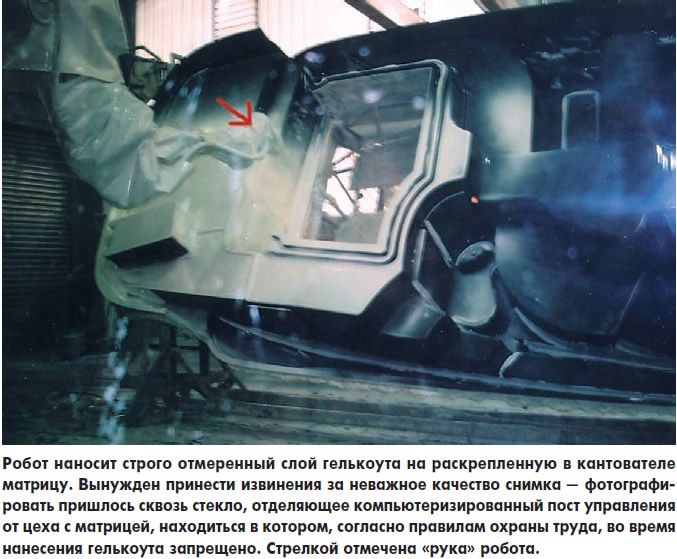 Матрицу, раскрепленную под строго установленным углом в колесном кантователе, закатывают в ангар и оставляют там опять-таки в строго определенной позиции — согласно специальным меткам. Робот, в отличие от снабженной фотоэлементами автомобильной мойки, слеп, и, подобно же слепому, который легко ориентируется в собственной квартире, попросту «помнит» положение матрицы с точностью до миллиметра. Как и упомянутого слепого, которого в незнакомом месте достаточно всего один раз провести за руку, чтобы он больше не натыкался на всякие посторонние предметы, робота «учит» опытный мастер, вручную манипулируя его «рукой», задавая и сложную конфигурацию ее перемещений, и количество гелькоута, подаваемого через форсунку (на стыках и перегибах полагается класть побольше, на ровных плоскостях — поменьше). Компьютер записывает все его действия, а после робот полностью их повторяет. Если для оформления корпуса используется гелькоут разных цветов, применяется соответственно и несколько разных компьютерных программ — робот трудится над матрицей в несколько проходов (например, один для белого и другой для синего), хотя шаблонные маски, прикрывающие те или иные участки матрицы, наклеиваются вручную.