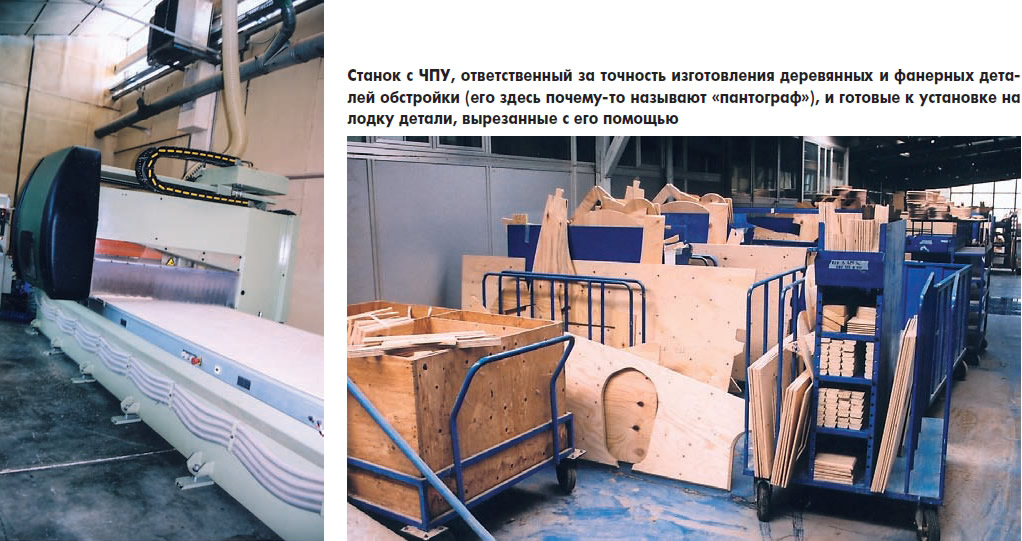 Кстати, и на промежуточных операциях задействованы роботы. Все деревянные и фанерные детали вырезает станок с ЧПУ (ребята из «Gobbi» называют его «пантограф»), способный не только с ювелирной точностью соблюсти сложные контуры переборки, пайола или потолочной панели, но и вы-фрезеровать на детали декоративный узор. А вот ткань и ковролин для внутреннего убранства кают здесь по-прежнему кроят вручную — дело тонкое, и подгонка по месту неминуема.