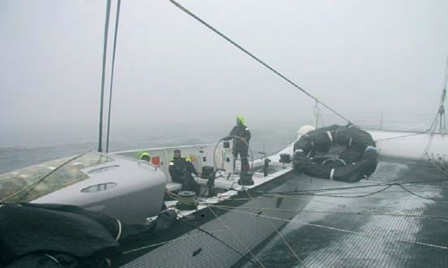 К этому рейсу французы готовились очень тщательно: пошили очень плоские паруса, максимально облегчили яхту, сэкономив даже на продуктах и теплых вещах. Планировали уменьшить и количество людей на борту: вместо штатных 13 взять десятерых: две ходовые вахты по четыре человека плюс сам капитан и навигатор. Но от такой схемы Бруно отказался по соображениям безопасности, однако и взяв в плавание 12 человек, едва смог избежать проблем: поздно ночью на третий день пути на скорости без малого в 35 уз катамаран зацепил огромную льдину. По счастью, ходовая вахта в последние секунды все же успела отвернуть: «Orange II» «всего лишь» чиркнул по подводной части ледяной скалы наветренным рулем, срезав его как бритвой. Чтобы избежать переворота (наветренный руль играет важную роль в обеспечении динамической остойчивости), экипаж был вынужден снизить скорость и не так форсировать парусами. К моему удивлению, в последующем телефонном интервью с нами Бруно Пейрон оценил общую потерю времени из-за поломки всего в 8 или 9 часов.