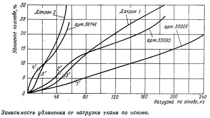 При эксплуатации парусов ткань испытывает нагрузки, величины которых значительно меньше разрывной. Поэтому вызывают большой интерес особенности деформации ткани именно при подобных эксплуатационных нагрузках. На рисунках представлены кривые зависимости удлинения ткани по основе и утку от нагрузки. Эти данные были зафиксированы в системе прямоугольных координат на диаграммной ленте записывающего устройства разрывной машины РТ-250. Как следует из графиков, в точках 1', 2', 3', 4', 5', соответствующих нагрузке в размере 25% от разрывной, величина удлинения образцов импортных тканей и отечественных практически не имеет существенного различия.