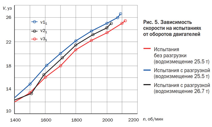 На рис. 5 показаны зависимости скорости хода от оборотов двигателей для трех вариантов испытаний. Приводим фото, иллюстрирующие движение яхты на полном ходу (рис. 6). Испытания проводились с «тяжелыми» винтами, и номинальные режимы работы двигателей (2300 об/мин) достигнуты не были. Согласно прогнозу фирмы-изготовителя винтов «BT Marin», сделанному на основе имеющихся результатов испытаний для заказанных новых винтов при тех же водоизмещениях 25.5 и 26.7 т - расчетные значения максимальной скорости с учетом разгрузки составляют 29 и 27.5 уз.