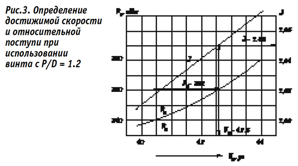 Далее в точках пересечения зависимостей KT = f(J) и KNT = const находим значения KT, J и η₀, а затем по ним рассчитываем требуемую мощность и диаметр гребного винта. Указанные операции были выполнены для трех винтов серии с P/D = 1.1; 1.2; 1.4. Было найдено, что максимальную скорость обеспечивает гребные винты с P/D = 1.2, соответствующие этому винту значения характеристик приведены в табл. 4 и на рис. 3.