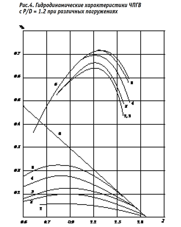 Рис. 4. Гидродинамические характеристики ЧПГВ с P/D=1.2 при различных погружениях