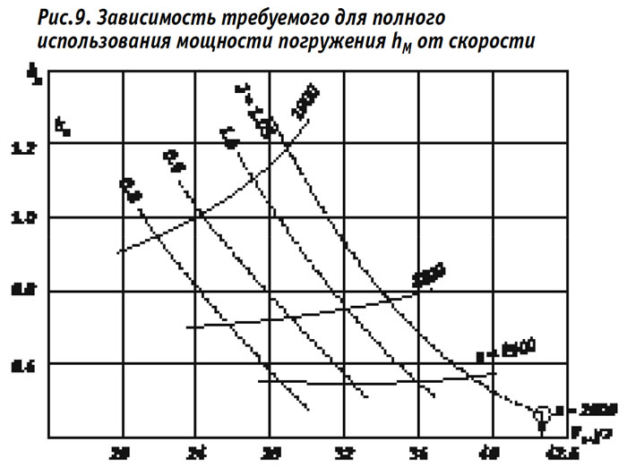 Затем находится требуемое погружение винта hM, требуемое для использования полной мощности PSM, и определяется создаваемая при этом полезная тяга ТЕМ, максимально возможная на рассматриваемой скорости. Примеры подобных расчетов приведены в табл. 5, а соответствующие графики на рис 5.