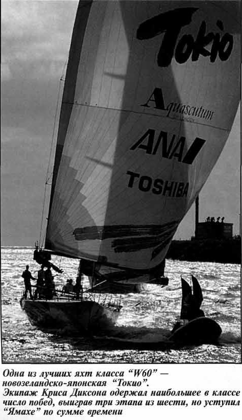 Разве что Крис Диксон в безутешном горе своем нашел силы бороться и в отчаянном броске показал, кто больше всех достоин награды: он вновь выиграл этап, опередив американцев на "Уинстоне" на 1 минуту и "Ямаху" на 1.5 минуты. Первое место на заключительном этапе позволило "Токио" с 10 места после 5 этапов передвинуться на 5 строку итоговой таблицы результатов. "Ямаха", придя 3-ей, заслуженно заняла итоговое 1-е место, "Юстиция" — 2-е, "Галиция" — 3-е. В классе "Макси" новозеландцы и выиграли этап, и стали абсолютными победителями регаты, улучшив прежний рекорд кругосветного 6-этапно-го перехода но тому же маршруту (1989-1990 гг.) на целых 8 дней! А ют решить вопрос о том, яхты какого класса быстроходнее, на основании таблицы результатов, пожалуй, не удастся. Сравните суммы времени победителей в классе "Макси" — 120.05.09.23 и в классе "W60" — 120.14.55.00. Какие-то 9-10 часов разницы при четырехмесячной гонке!