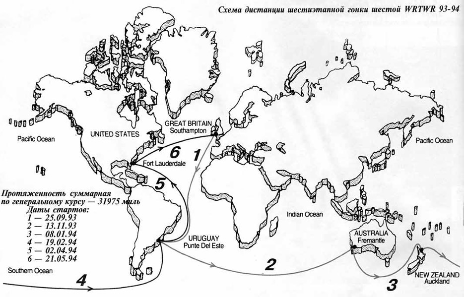 Постоянным читателям "КиЯ" можно не представлять традиционный кругосветный марафон, названный именем спонсора — широко известной пивоваренной фирмы "Уитбред". О первой гонке WRWR 1973-1974 гг. подробно рассказывалось в №41, №48 и №51, о второй (1977-78 гг.) — в №75, о третьей (1981-82 гг.) — в №101, о четвертой (1985-86 гг.) — в №126, о пятой (1989-90 гг.) — в №145, №146, №147, №148, №149, №150, №151.