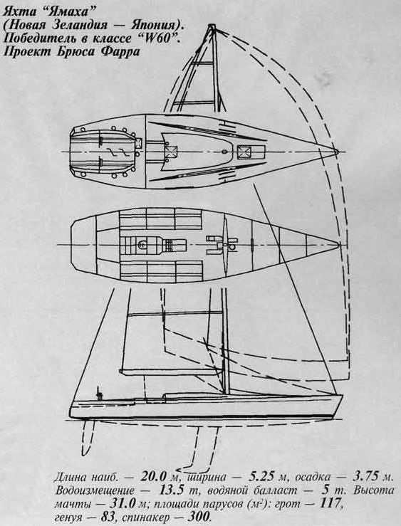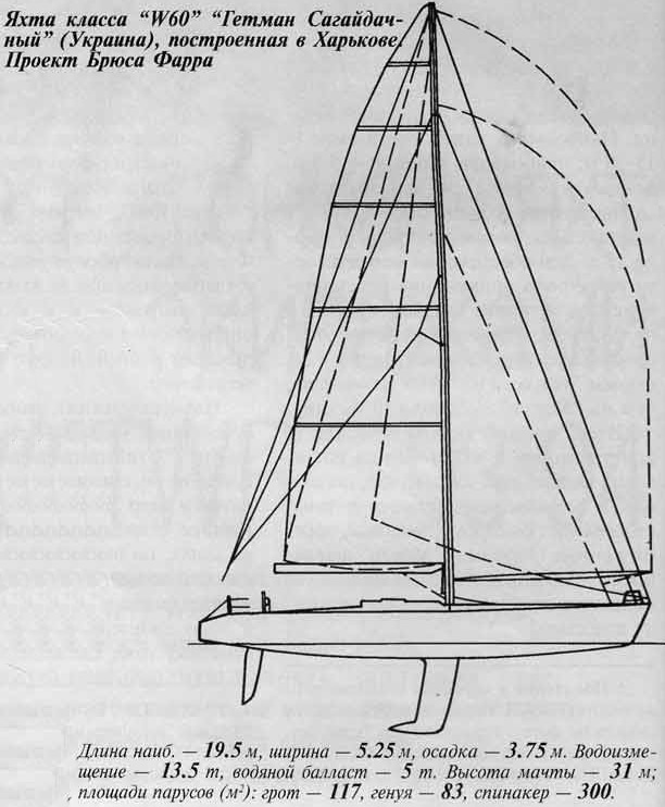 Напомним, что класс "W60", удовлетворяющий новым правилам (Whitbread Offshore Rule), был разработан общими усилиями 14 ведущих яхтенных конструкторов в качестве замены уходящим со сцены классам В и D. "Крестным отцом" его по праву считают знаменитого новозеландца — Брюса Фарра, возглавляющего ныне сразу две американские компании со штаб-квартирами в Аннаполисе.