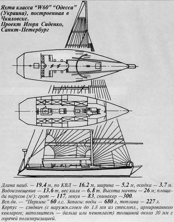 Имелось в виду, что "60-футовики", представляющие собой несколько более практичный вариант яхт ULDB, т.е. яхт сверхлегкого водоизмещения по идее Джорджа Олсона (см. "КиЯ" №143 и №145), будут не менее быстроходными, чем "Макси", но существенно более легкими, меньшими по размерениям и дешевыми. По своей архитектуре они напоминают экстремальные яхты, строящиеся для гонок на Кубок Америки, но имеют более высокий борт (не менее 1.5 м), несколько большее водоизмещение и оборудованы для плавания в открытом океане. Наибольшая длина такой яхты — 18-20 м, наибольшая ширина — 5.2 м, осадка — 3.66-4.27 м, максимальная лавировочная парусность — 200 м², минимальное водоизмещение — около 15 т. Для обеспечения остойчивости разрешено применение перемещающегося водяного балласта (по 2.5 т на борт). Разрешены мачты из углепластика и спинакера асимметричной формы. Экипажи на "W60" поменьше, чем на "Макси", — около 10 человек.