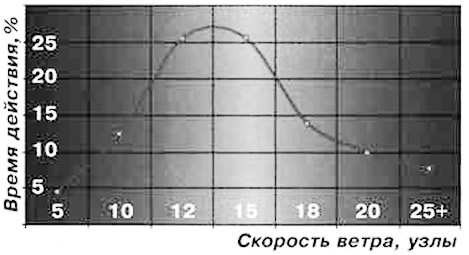 Приводимый график представляет собой кривую распределения средней скорости ветра на гоночной дистанции, подтвержденную статистикой. Как показывает практика, гонки "ВОС" и "Whitbread" выигрываются (если не происходит поломок или крушения) в Атлантическом океане и характеризуются слабым ветром на старте и финише каждого этапа. Эта информация подсказала оптимальную площадь парусов для 12-метровых яхт — грот площадью 76.2 м2 и 118-метровый спинакер. Бушприт и мачта увеличенной высоты служат для постановки очень больших передних парусов. Увеличение площади грота, достигнутое за счет удлинения мачты и увеличения кривизны грота, дало возможность пользоваться кливером, не перекрывающим грот, при любой ветровой нагрузке.