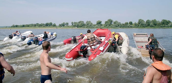 14 июля - заезд. К лагерю потихоньку подтягиваются машины участников, на пустом поле вырастают палаточные городки, разжигаются костры. Кто-то достает гитару, и веселая песня поднимает всем настроение. На берегу вовсю идет сборка лодок, к вечеру насчитали уже около 80 комплектов. В этом году стало заметно, как сильно, по сравнению с прежними годами, изменились предпочтения людей при выборе средств передвижения на воде. Уже практически отсутствуют маленькие двигатели мощностью до 10 л.с., теперь все больше моторов мощностью 15 л.с., очень много появилось двигателей - 20-30 л.с. и выше. Новинки этих «покатушек» - РИБы, как импортного, так и российского производства, владельцы которых решили именно здесь, на окской воде попробовать их и убедиться в высоких скоростях, повышенной управляемости и главное - безопасности, по сравнению с обычными, жесткими корпусами. Благодаря спонсорам удалось устроить и тест-драйв оборудования для активного отдыха: водные лыжи, доски, разнообразные круги - все было нарасхват. Многие впервые увидели новые для России моторные катамараны.